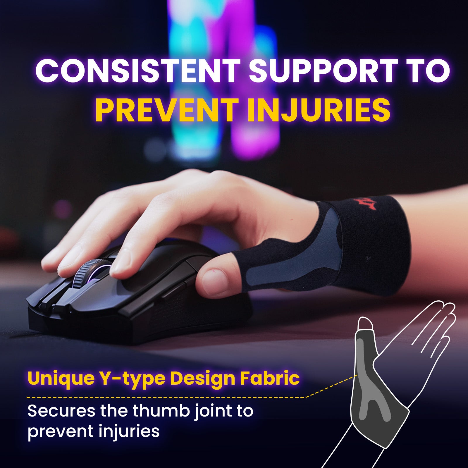 Our gamer's thumb brace features a unique Y-shaped elastic fabric that provides reliable support. It helps prevent injuries, reduce inflammation, and protect against recurring thumb issues. Defeat your rivals without worry!